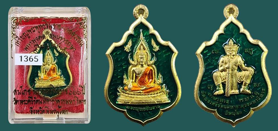 ( เลข 1365 ) เหรียญโล่ห์พระพุทธชินราช หลังยันต์วิเศษอกเลาโภคทรัพย์ เนื้อทองทิพย์ลงยาสีเขียว เหนี่ยวทรัพย์ รุ่น สมโภชพระพุทธชินราช ครบ ๖๖๖ ปี |