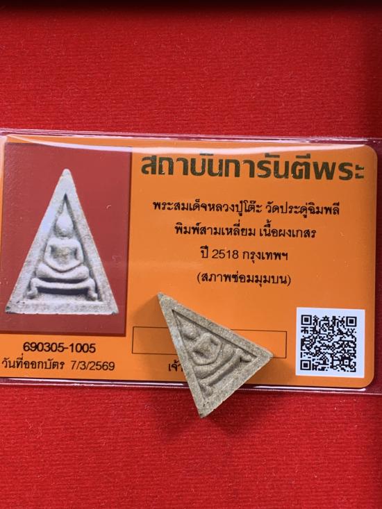 พระสมเด็จสามเหลี่ยมหลวงปู่โต๊ะ ปี 18 เนื้อเกสร มีซ่อมมุมบนนิดครับ พระสวย มาพร้อมบัตรรับรองครับ