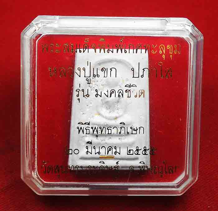 พระสมเด็จพิมพ์เกศทะลุซุ้ม รุ่น มงคลชีวิต หลวงปู่แขก วัดสุนทรประดิษฐ์ จ.พิษณุโลก ผสมมวลสารสังฆาฎิ โรยผงเก่าสมเด็จ มีเกศา ฝังตะกรุดทอง 1 ดอก หมายเลข 28 สร้าง 999 องค์ สวยตามรูป |