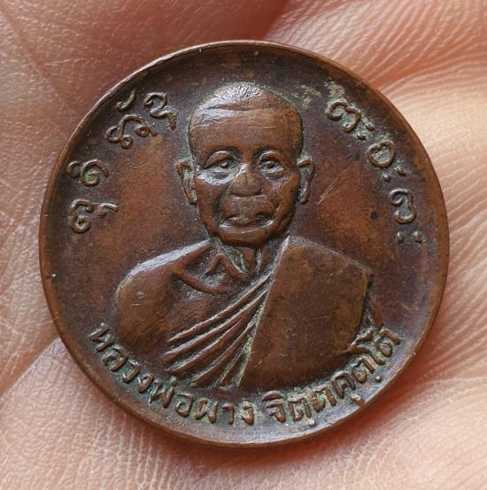 วัดใจเหรียญขวัญถุงหลวงพ่อผาง เนื้อทองแดงรมน้ำตาล ปี2518 |