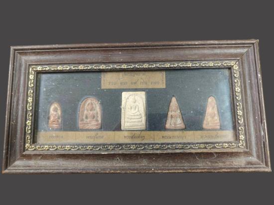 A8278.พระเนื้อดินผง ชุด 5 องค์ พระสมเด็จ พระซุ้มกอ พระรอด พระนางพญา พระผงสุพรรณ กรอบเก่าสำหรับตั้งบูชา ไม่ทราบที่ เคาะเดียวเเดง |