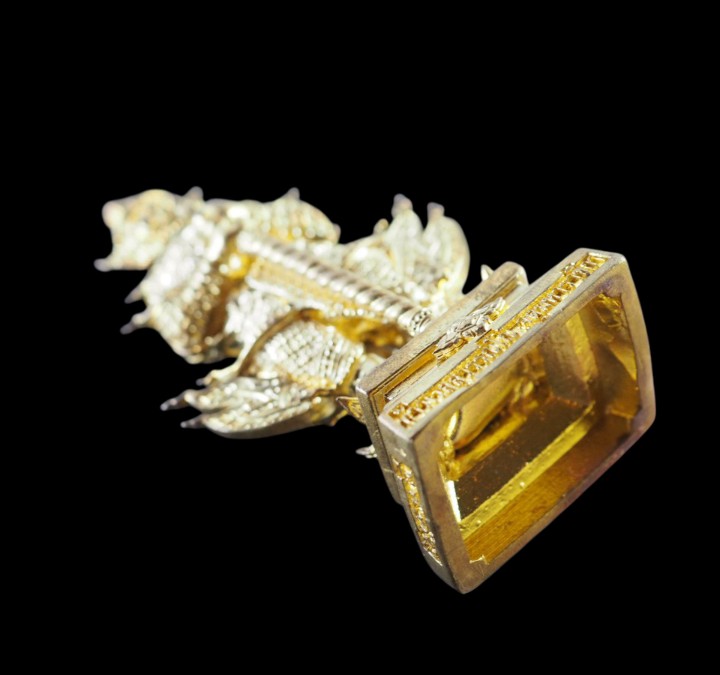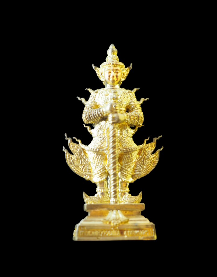 0300 รูปหล่อองค์บูชาท้าวเวสสุวรรณ วัดจุฬามณี จังหวัดสมุทรสงคราม สูง 4 นิ้ว หน้าฐาน 1.5 นิ้ว เนื้อทองเหลืองกะไหล่ทอง หน้ายัก(หน้าเทวดา) |
