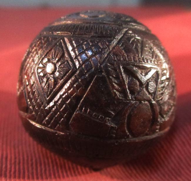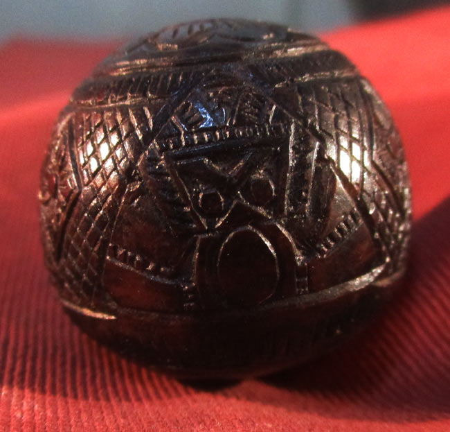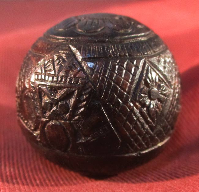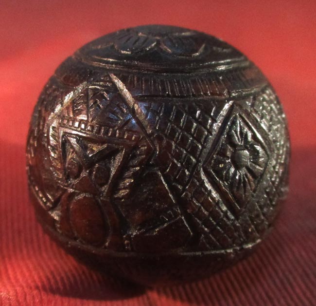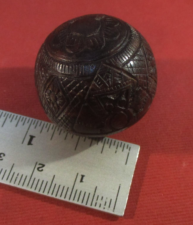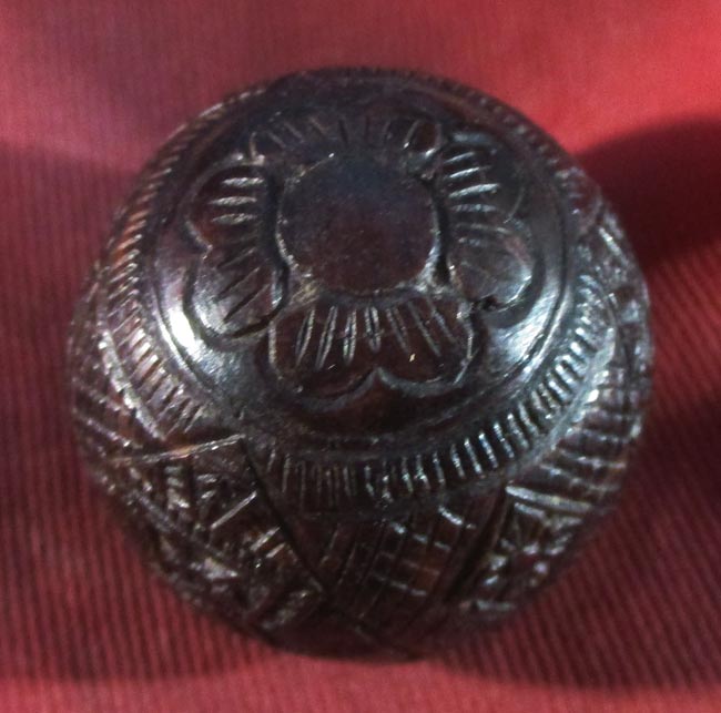เครื่องรางของขลัง ไม่ทราบที่ เนื้อไม้แกะ ด้านในมีเม็ดกริ่ง เขย่าแล้วดัง ครับ ไม่แน่ใจเป็นเนื้อไม้กะลาไหมนะครับ