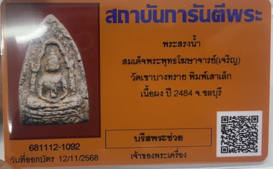 พระสมเด็จสรงน้ำ สมเด็จพระพุทธโฆษาจาร์ย(เจริญ) วัดเขาบางทราย พิมพ์เสาเล็ก เนื้อผง ปี 2484 จ.ชลบุรี พร้อมบัตร G-PRA