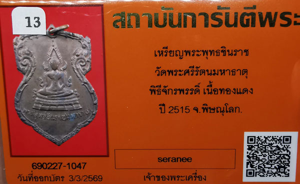 เหรียญพระพุทธชินราช วัดพระศรีรัตนฯ รุ่นมั่นในธรรม เนื้อทองแดง ห่วงเดิม ปี2515 จ.พิษณุโลก + บัตรG-pra สภาพเดิมค่ะ