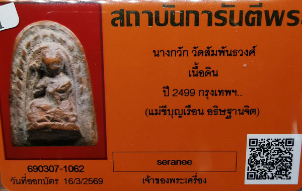นางกวัก วัดสัมพันธวงศ์ เนื้อดิน ปี2499 จ.กรุงเทพฯ(แม่ชีบุญเรือน อธิษฐานจิต) + บัตรG-pra สภาพเดิมค่ะ |