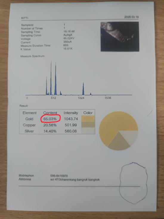 กรอบทองมือ2 ทรงเสมา น้ำหนักประมาณ 1.39 กรัม เปอร์เซ็นต์ทองประมาณ 65%