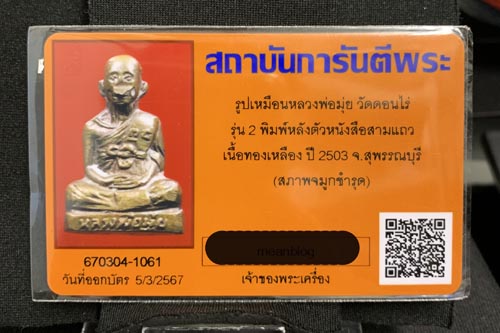 รูปหล่อหลวงพ่อมุ่ย รุ่น 2 วัดดอนไร่ สุพรรณบุรี ปี 2503 กริ่งดัง ตัวหนังสือ 3 แถว พร้อมบัตรรับรอง