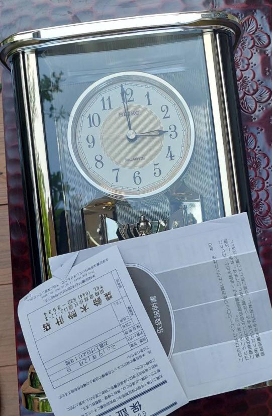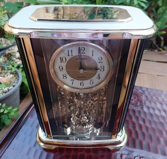 นาฬิกาตั้งโต๊ะโบราณยี่ห้อ Seiko รุ่นที่มีตุ้มเหวี่ยงแบบหมุน สภาพใหม่แกะกล่อง มีใบรับประกัน และคู่มือ