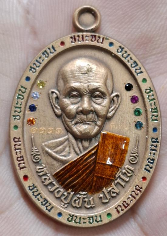 เหรียญ ชนะจน หลวงปู่ฝั้น ปสาโท วัดศรีถมอรัตน์ จ.เพชรบูรณ์ เนื้อทองแดงซาติน ลงยา ฝังพลอย กล่องเดิม |