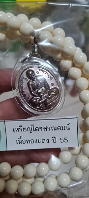 เหรียญไตรสรณคมน์ เนื้อทองแดง หลวงตาม้า วัดถ้ำเมืองนะ พร้อมรอยจารหลวงตาม้า เลี่ยมจากวัดพร้อมประคำ