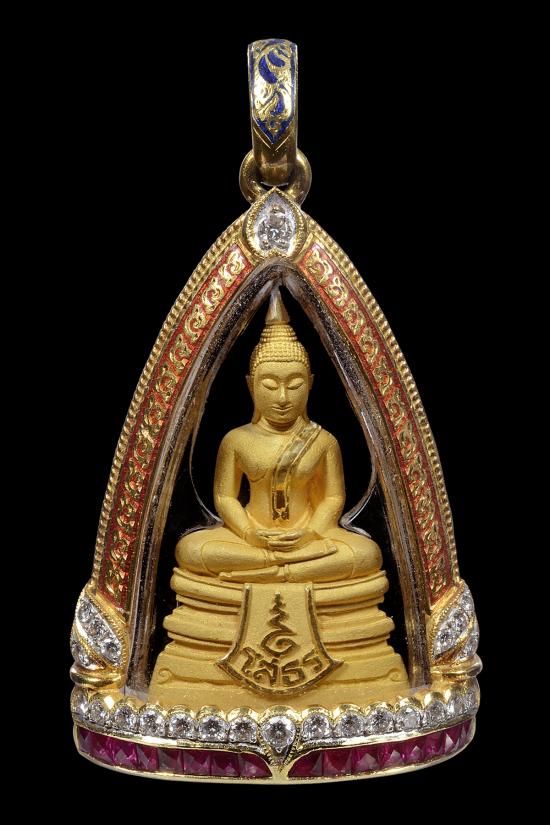 ความพิเศษขององค์นี้คือมาพร้อมกับตลับทองคำสั่งทำพิเศษ งานฝีมือละเอียดประณีต ฝังเพชรแท้และพลอยแดง