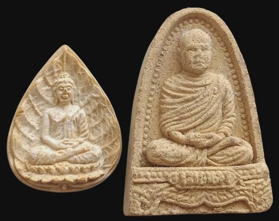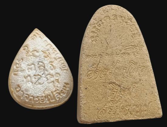 พระผงใบโพธิ์ พระอาจารย์เปลี่ยน ปัญญาปทีโป + พระผงพิมพ์เตารีด พระอาจารย์เปลี่ยน พิมพ์ใหญ่ เนื้อสีเหลือง โรยเส้นเกศาด้านหลัง ฝังข้าวสารดำ สภาพสวยเก็บเดิม ๆ |
