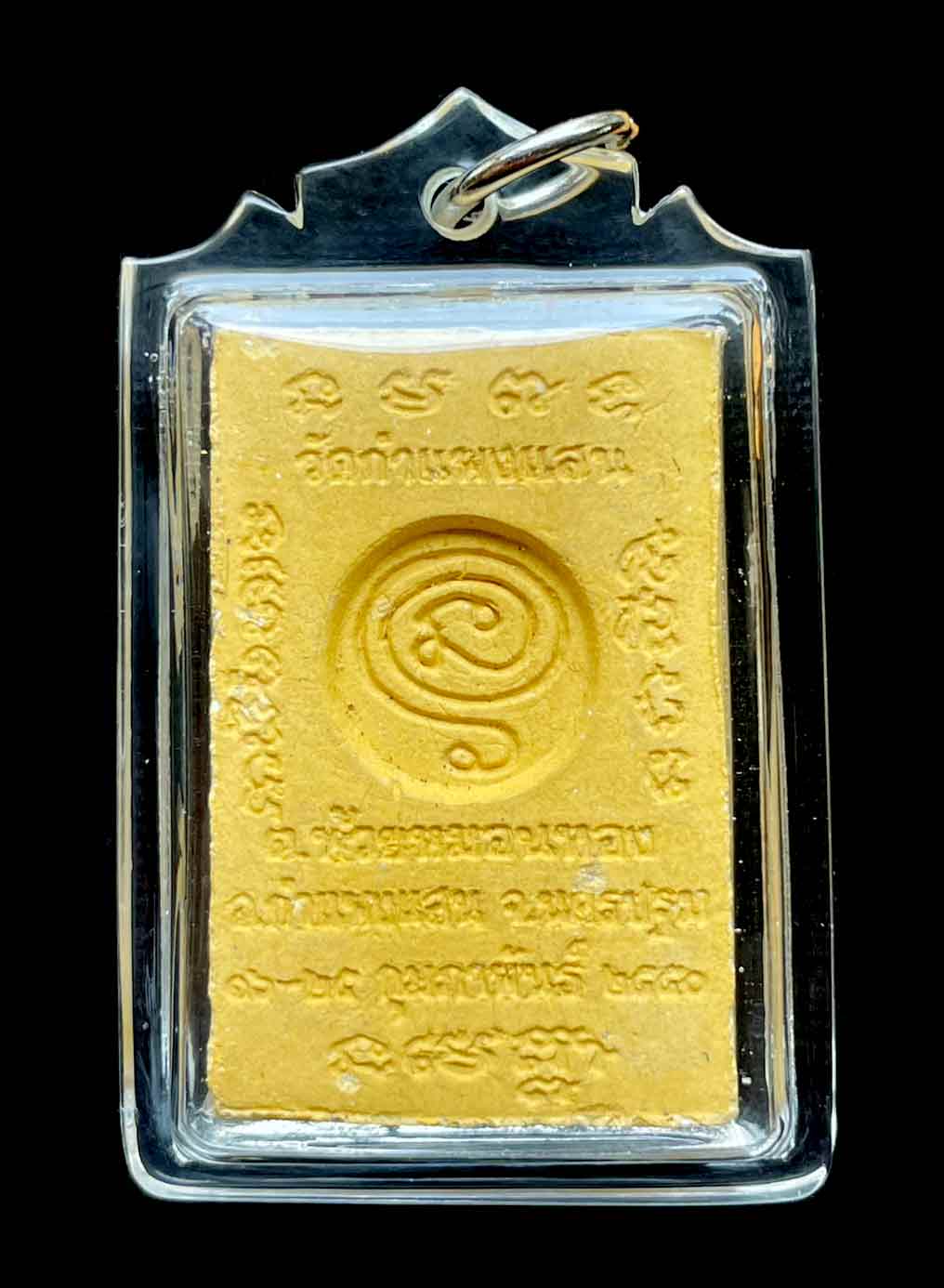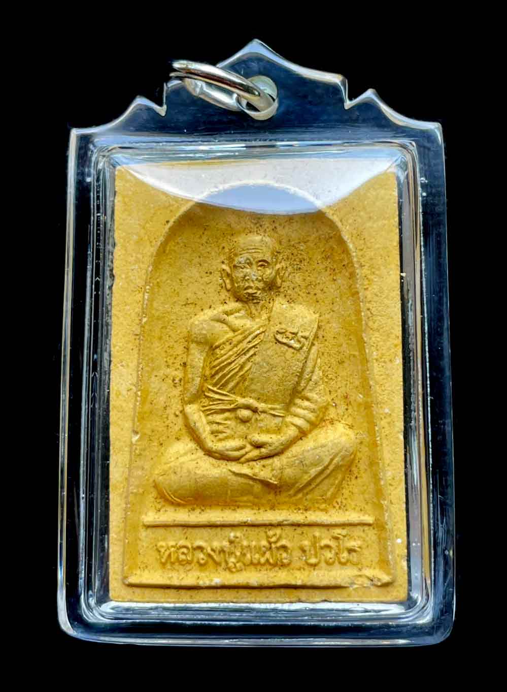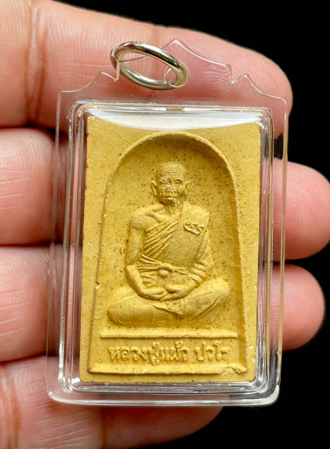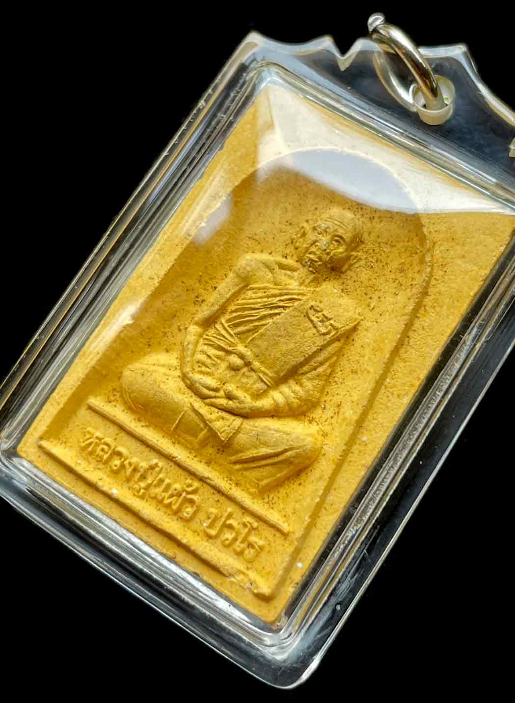 พระผงรูปเหมือน หลังยันต์ (สีเหลือง) ปี 2550 หลวงปู่แผ้ว ปวโร วัดกำแพงแสน จ.นครปฐม เลี่ยมพลาสติก สวยงาม