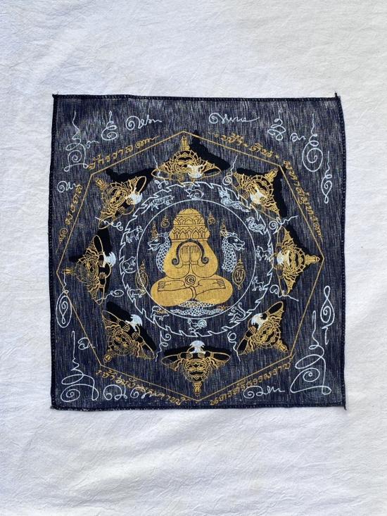เคาะเดียวแดง ผ้ายันต์ พังพระกาฬ เสริมดวง อุดมมงคล รุ่นมงคลจักวาล ขนาด30/30ซม มีตราประทับ สีดำ |