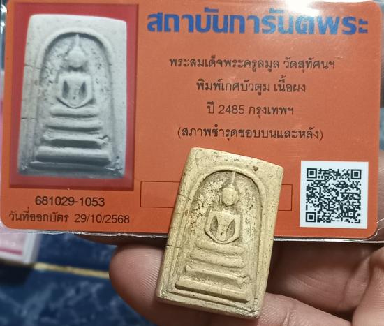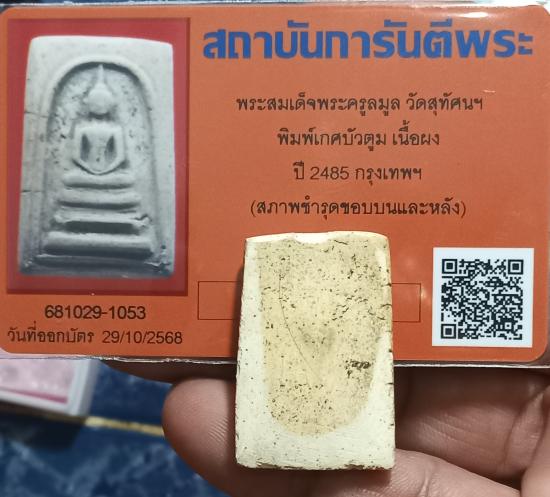 เคาะเดียวแดง++พระสมเด็จพระครูลมูล วัดสุทัศนฯ พิมพ์เกศบัวตูม เนื้อผง ปี 2485 กรุงเทพฯ (มาพร้อมบัตรสภาพชำรุดขอบบนและหลัง)