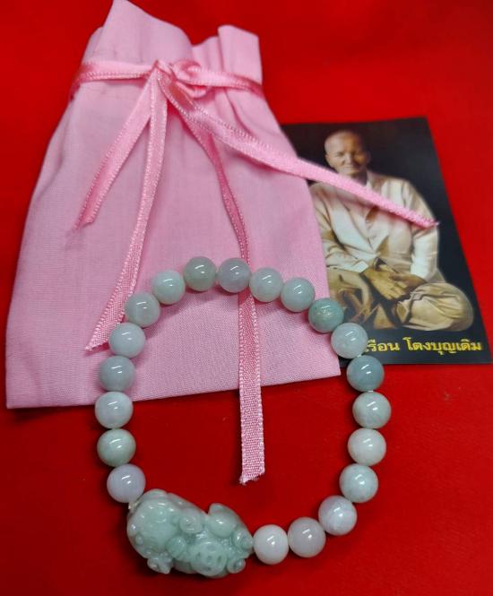 ***วัดใจ***สร้อยข้อมือปี่เซี๊ยะ หินหยกพม่า สีพาสเทล (Pastel Jade) 8 มิล กับถุงเหนี่ยวทรัพย์ วัดอาวุธฯ พร้อมการ์ดใบคาถา