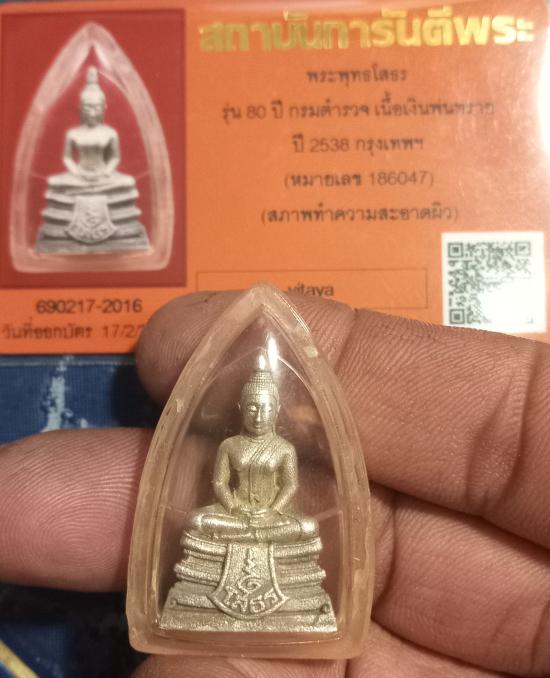 เคาะเดียวแดง+++หลวงพ่อพระพุทธโสธร รุ่น 80 ปี กรมตำรวจ เนื้อเงินพ่นทราย ปี 2538 กรุงเทพฯ (หมายเลข 186047) สวยเดิมๆ จมูกโด่ง มีเส้นคอ มีกล่องเดิมๆ มีบัตรรับรองพระแท้สภาพทำความสะอาดผิว