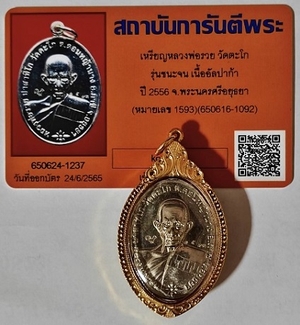 เหรียญชนะจน ปี ๒๕๕๖ หลวงพ่อรวย วัดตะโก เนื้ออัลปาก้า หมายเลข 1593 ไม่เคยผ่านการใช้งาน เลี่ยมทองพร้อมใช้