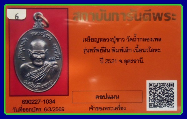 บัตรการันตี พิมพ์เล็ก-900- เหรียญนวโลหะ รุ่นทูลเกล้า ทรัพย์สินฯ หลวงปู่ขาว อนาลโย วัดถ้ำกลองเพล พศ.2521