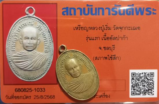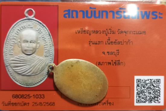 เคาะเดียวแดง+++เหรียญหลวงพ่อเริ่ม หลวงปู่เริ่ม วัดจุกกะเฌอ รุ่นแรก เนื้ออัลปาก้า มาพร้อมบัตรการันตี(สภาพใช้สึก)