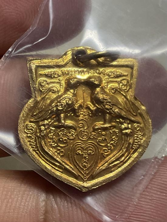เหรียญหน้าฐานเล็ก หลังนกสาริกา เนื้อทองดอกบวบ หมายเลข ๒๗๑๕๘ หลวงปู่กาหลง เขี้ยวแก้ว วัดเขาแหลม