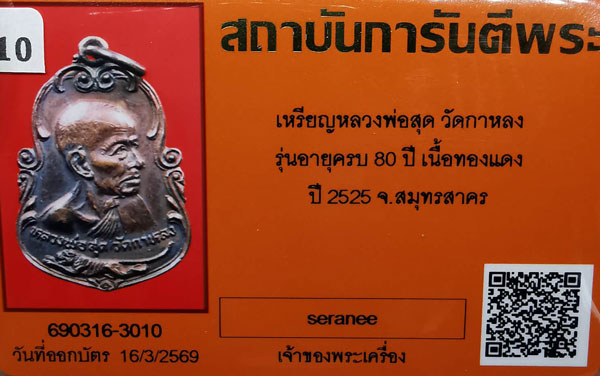 เหรียญหลวงพ่อสุด วัดกาหลวง รุ่นอายุครบรอบ80ปี(รางคู่) เนื้อทองแดง ห่วงเดิม ปี2525 จ.สมุทรสาคร + บัตรG-pra สภาพสวยเดิมค่ะ สภาพตามรูปทุกประการค่ะ