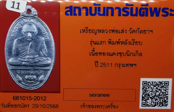 เหรียญหลวงพ่อเส่ง วัดกัลยาฯ รุ่นแรก พิมพ์หลังเรียบ เนื้อทองแดงชุบนิกเกิล ปี2511 จ.กรุงเทพฯ + บัตรG-pra สภาพสวยเดิมค่ะ