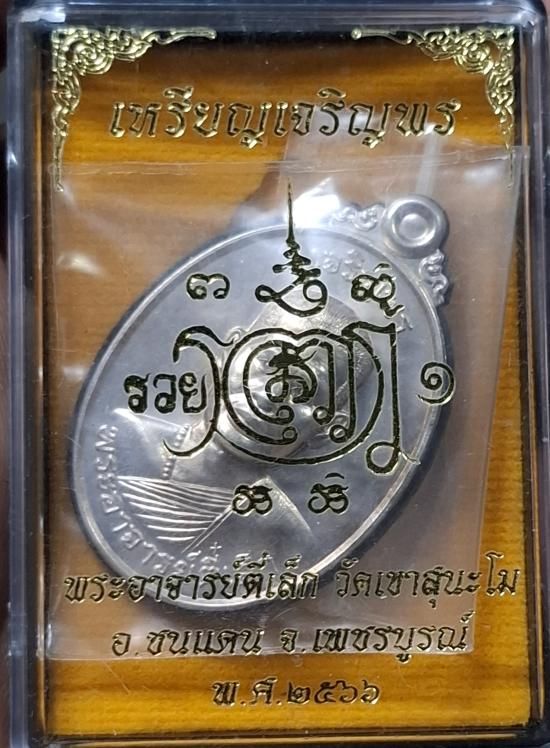 เหรียญเจริญพร อ.ตี๋เล็ก วัดเขาสุนะโม จ.เพชรบูรณ์ เนื้อนวโลหะหลังเรียบจารมือ หน้ากากแผ่นเงิน พร้อมกล่องเดิม
