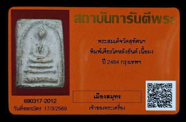 พระสมเด็จวัดสุทัศนฯ พิมพ์เศียรโตหลังยันต์ เนื้อผง ปี 2484 รุ่นอินโดจีน มวลสารพระสมเด็จวัดระฆังฯ สวยคม สมบูรณ์ กรุงเทพฯ พร้อมบัตรG...