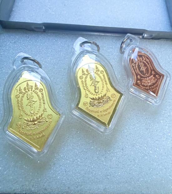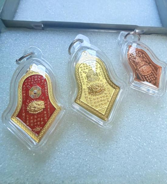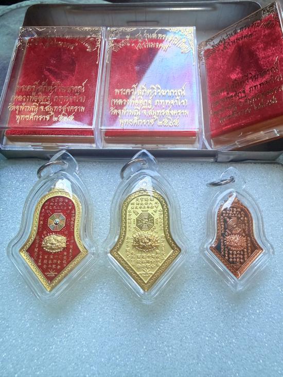**วัดใจ3เหรียญ** กันชง จำปี ชนวนกะหลั่ยทองลงยาแดง1(พิมพ์ใหญ่)+1ชนวนกะหลั่ยทอง พ่นทราย(ใหญ่)+1ทองแดงขัดเงา(เล็ก) หลวงพ่ออิฏฐ์ วัดจุฬสมณี(พร้อมกล่อง)