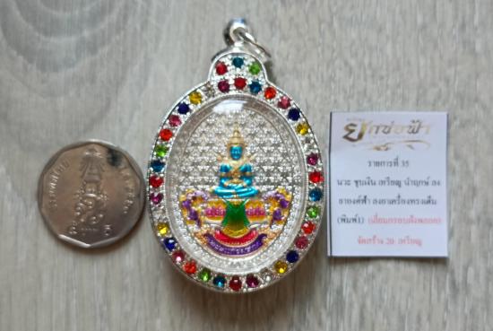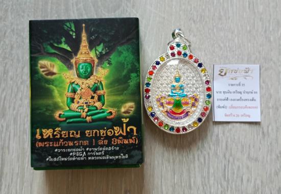 ชื่อพระเครื่อง วัดใจเคาะเดียวแดงจ้า เหรียญพระแก้วมรกต รุ่นยกช่อฟ้า วัดท้ายน้ำ เนื้อนวะชุบเงินลงยาองค์สีฟ้า นำฤกษ์ พร้อมตลับฝังพลอยสี เคาะเดียวแดงจ้า