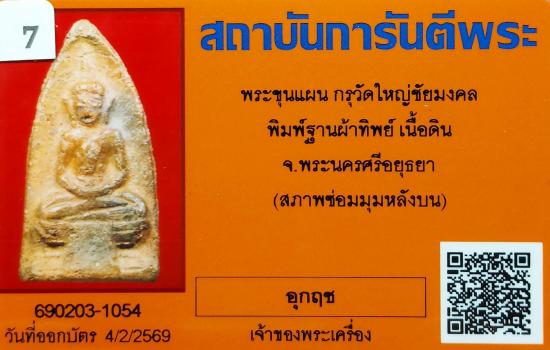 พระขุนแผน กรุวัดใหญ่ชัยมงคล พิมพ์ฐานผ้าทิพย์ เนื้อดิน จ.พระนครศรีอยุธยา พระระดับตำนานของเมืองอยุธยา เป็นพระกรุเดียวกันกับพระขุนแผนเคลือบ,ขุนแผนใบพุทรา, นางหน้าอิฐ กรุวัดใหญ่ชัยมงคล องค์นี้พระสภาพสวย มีหน้าตา ตามผิวมีรักทองเดิมจาากรุ รายละเอียดของพระคมชัด ลึก มาก พระได้เต็มฟอร์ม จัดเป็นพระที่น่าสะสมมาก ด้านพุทธคุณดีทุกด้านเหมือนพระขุนแผนเคลือบกรุเดียวกัน มีตลับเงินอย่างดีพร้อมใช้ครับ