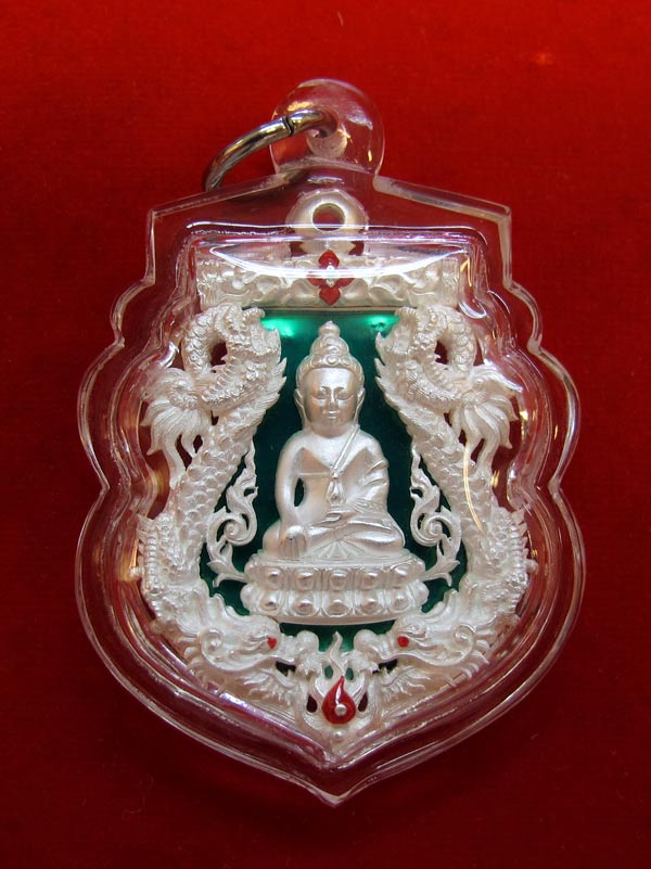เหรียญเสมาฉลุยกองค์ พุทธปวเรศ เนื้อเงินลงยาสีเขียว ตะกรุดทองคำ วัดบวรฯ สภาพสวย มีบัตรฯประจำองค์พระพร้อมกล่องเดิม หมายเลข 80