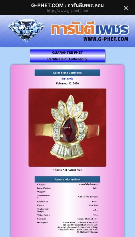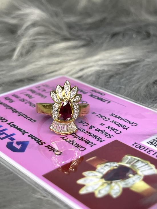 แหวนทับทิมล้อมเพชร ทับทิมแท้ เพชรแท้ 16 เม็ด , ทองแท้ 75%, น้ำหนักตัวเรือน 4.7 กรัม (size 50) พร้อมใบเซอร์จีเพชร