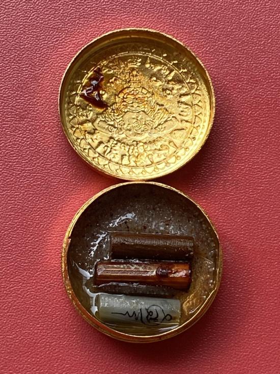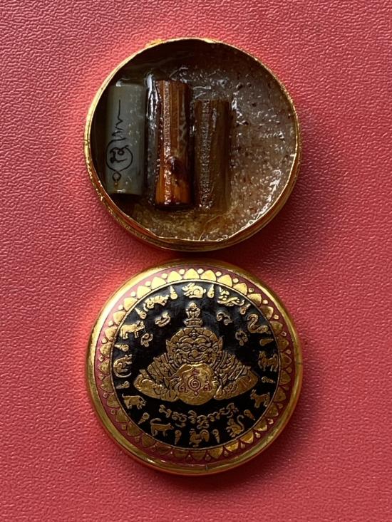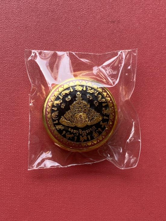 เคาะเดียวแดง สีผึ้งพระราหู รุ่น มงคลจักรวาล เนื้อ โลหะชุบทองลงยาสีดำขอบสีแดง ขนาด3.2ซม |
