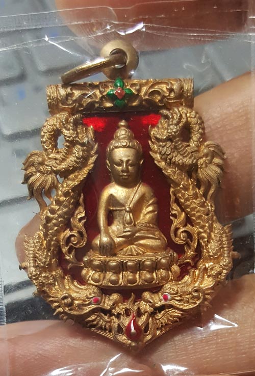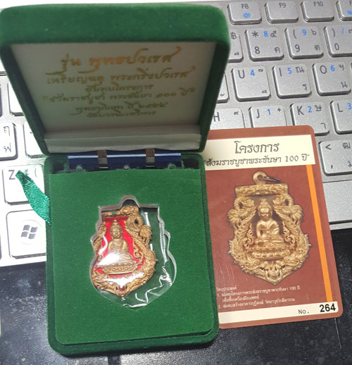 เหรียญเสมาฉลุยกองค์ พุทธปวเรศ เนื้อยรอนด์แก่ทองคำลงยาสีแดง วัดบวรฯ สภาพสวย มีบัตรฯประจำองค์พระพร้อมกล่องเดิม หมายเลข 264
