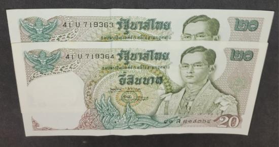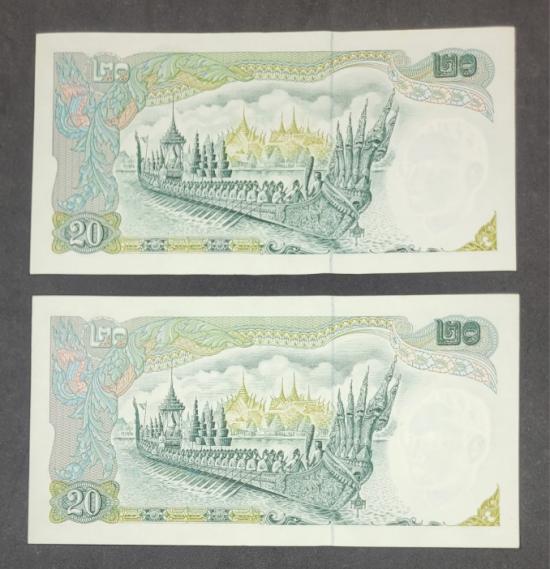 ธนบัตร 20 บาท หลังเรืออนันตนาคราช เลขเรียง 2 ฉบับ |
