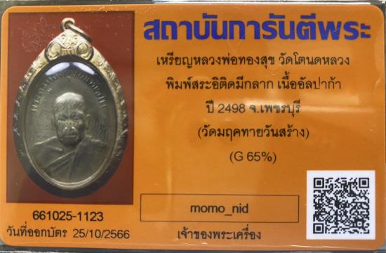 หลวงพ่อทองสุข วัดโตนดหลวง ออกวัดมฤคทายวัน ปี 2498 โดยหลวงพ่อจันทร์ซึ่งเป็นลูกศิษย์ เหรียญนี้เป็นเนื้ออัลปาก้าเลี่ยมทองแท้ พร้อมบัตรรับรอง
