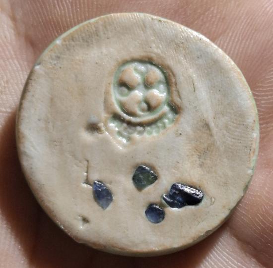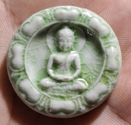 พระปทุมธรรมขันธ์ เนื้อกระเบื้องเคลือบ สีเขียว ด้านหลังฝังทับทิม หลวงป๋า วัดหลวงพ่อสดธรรมกายาราม จ.ราชบุรี |