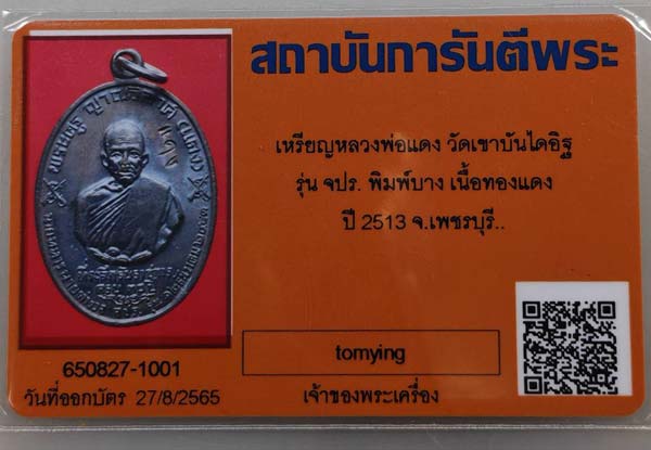 เหรียญหลวงพ่อแดง วัดเขาบันไดอิฐ รุ่นจปร. พิมพ์บาง สภาพสวยปรอท หน้าหลัง พร้อมบัตรรับรอง