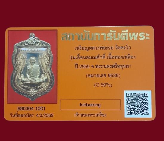 เหรียญหลวงพ่อรวย รุ่นเลื่อนสมณศักดิ์ ปี 59 เลี่ยมทองคำ + บัตรรับรอง