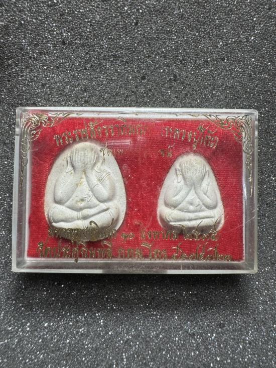 พระปิดตา หลวงปู่โต๊ะ วัดประดู่ฉิมพลี รุ่นเพชรรุ่งโรจน์ พิมพ์จัมโบ้หลังยันต์นะ ฝังตะกรุดทอง 2 ดอก และ พิมพ์หลังยันต์นะ ตะกรุดเงิน 2 ดอก ปี 2535 กล่องเดิม |