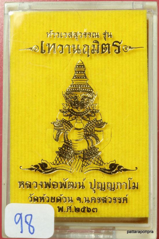 ท้าวเวสสุวรรณ หลวงพ่อพัฒน์ วัดห้วยด้วน รุ่นเทวนฤมิตร ปี 2563 เนื้อทองแดงลงยาเขียว หมายเลข 98 |
