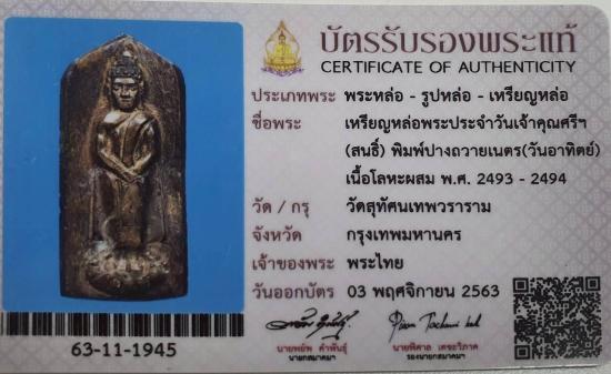 บัตรรับรองพระแท้ ออกโดย สมาคมผู้นิยมพระเครื่องพระบูชาไทย no. 63-11-1945