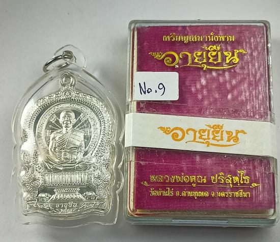 (เลขเดี่ยวสวย เบอร์ 9) เหรียญเสมานั่งพาน "อายุยืน" หลวงพ่อคูณ วัดบ้านไร่ เนื้อเงินหลังยันต์ "โค้ดแจก" เบอร์ 9 พร้อมเลี่ยม และกล่องครับ (น้ำหนักรวมเลี่ยม 24.41 กรัม)
