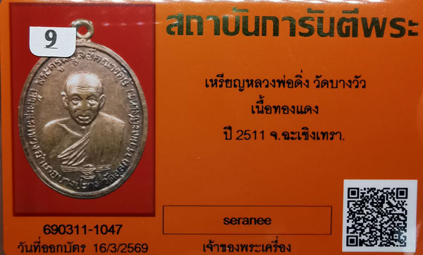เหรียญหลวงพ่อดิ่ง วัดบางวัว เนื้อทองแดง ปี2511 จ.ฉะเชิงเทรา + บัตรG-pra สภาพเดิมค่ะ
