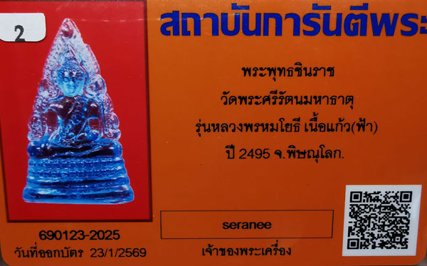 พระพุทธชินราช วัดพระศรีรัตนฯ รุ่นหลวงพรหมโยธี เนื้อแก้ว(ฟ้า) ปี2495 จ.พิษณุโลก + บัตร G-pra สภาพสวยเดิมค่ะ