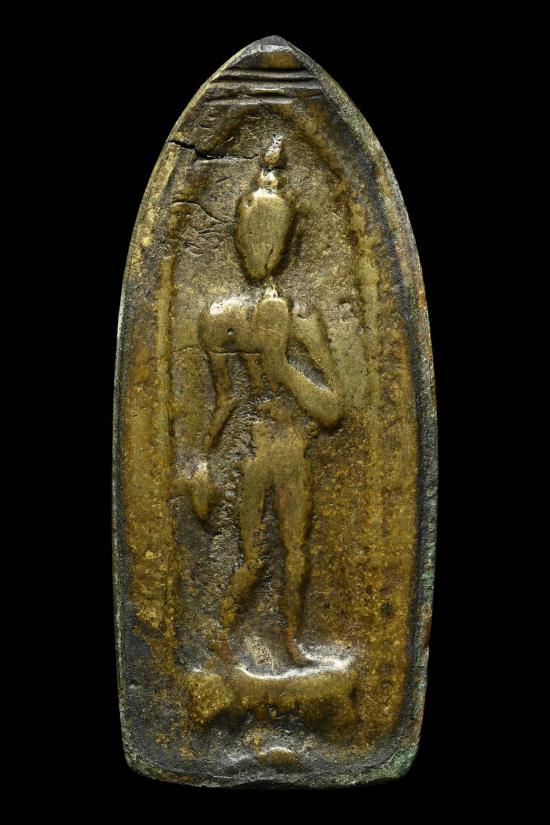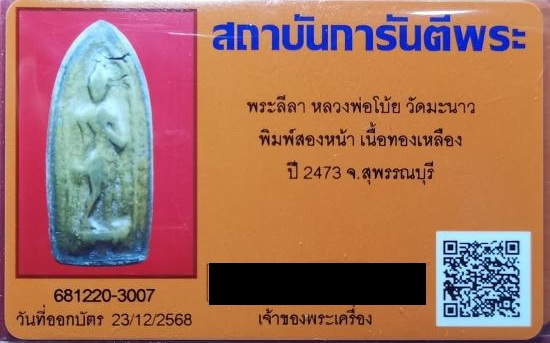 พระหลวงพ่อโบ้ย วัดมะนาว พิมพ์พระลีลาพิมพ์สองห้า เนื้อทองเหลือง ปี2473 จ.สุพรรณบุรี + บัตรรับรอง G-Pra