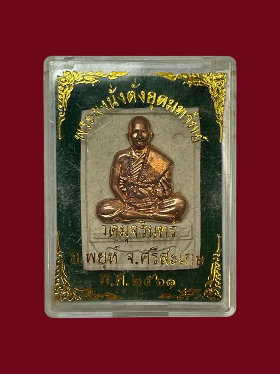 พระผงนั่งตั่งหลวงปู่อุดมทรัพย์(พระอาจารย์จ่อย) เนื้อผงรวมมวลสาร แก่ผงพุทธคุณ ติดหน้ากาทองแดง กดโค๊ต ยิงเลข ปี 2561 |